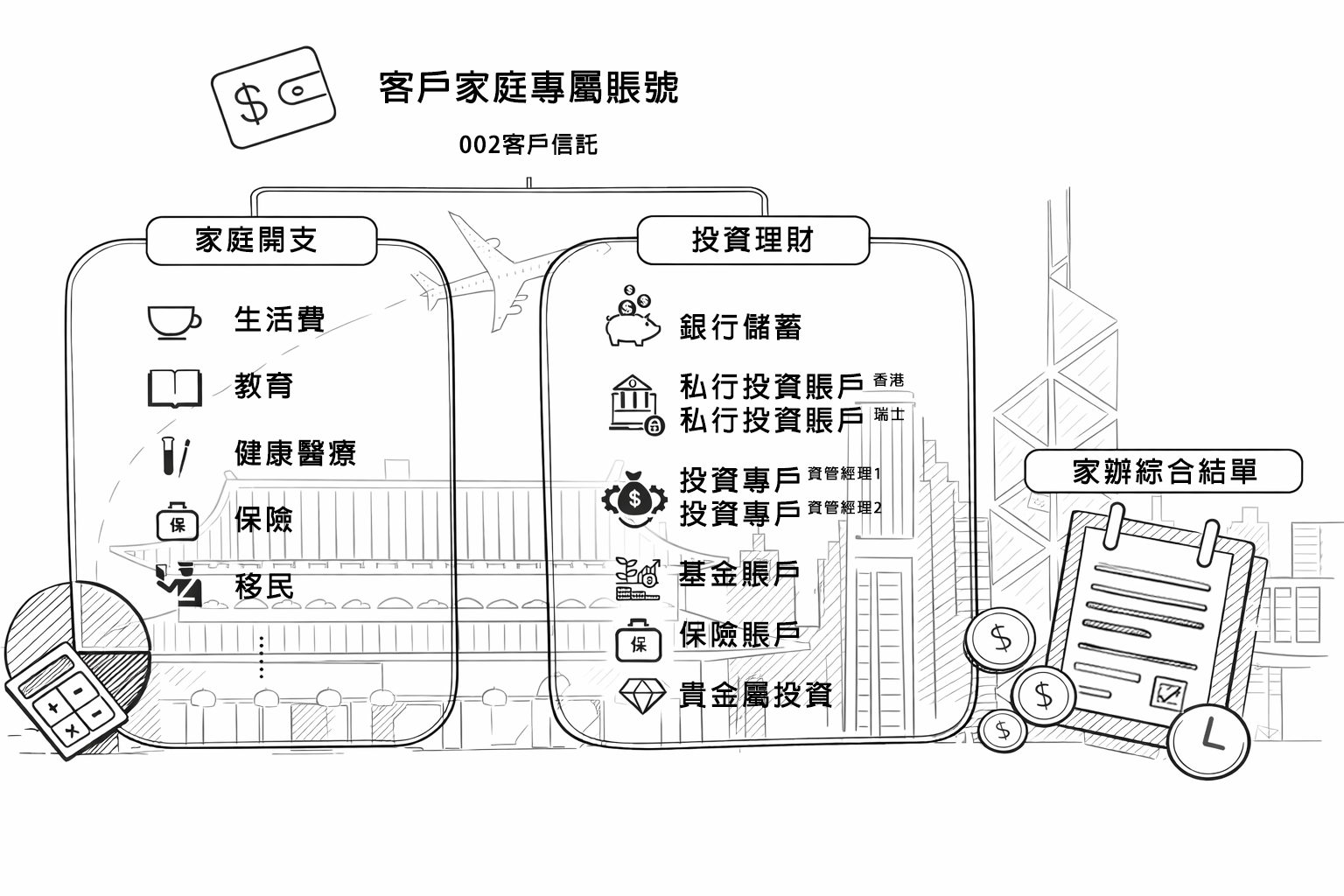 信託安排貼心細緻,照顧到客戶及家人現在及未來的各方面,包括日常生活、投資理財、家庭醫療安排、子女教育、移民規劃、養老保障、保險安排、遺產繼承等